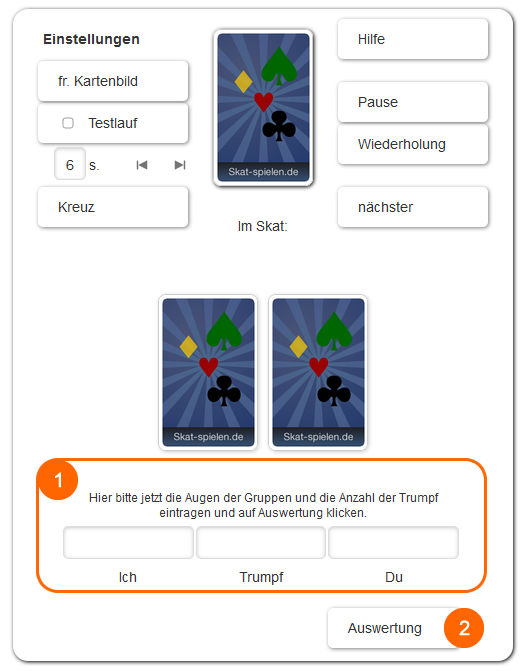 2. Nach dem Klick auf "Auswertung" wird die Anzahl der richtigen Augen der beiden Gruppen "Ich" und "Du", sowie die Zahl der in den Stichen gefallenen Trumpf angezeigt. Die beiden verdeckten Skatkarten werden aufgedeckt.
