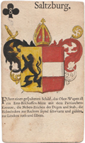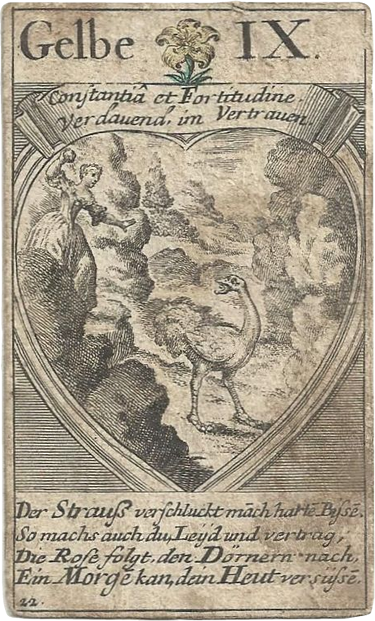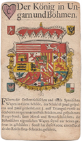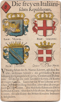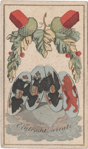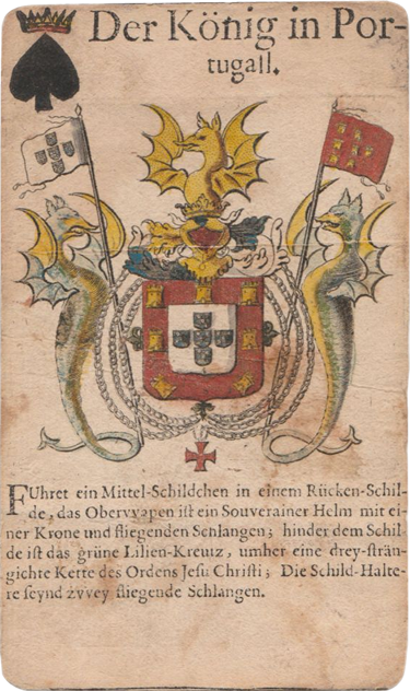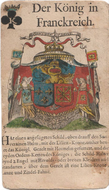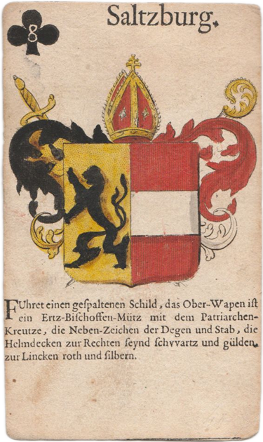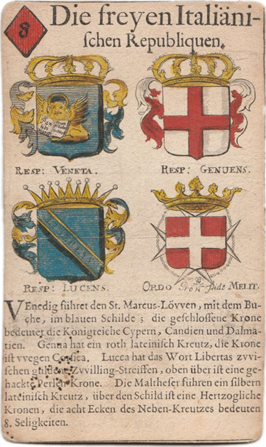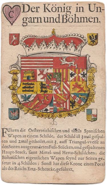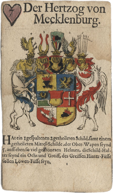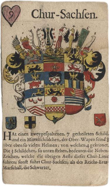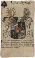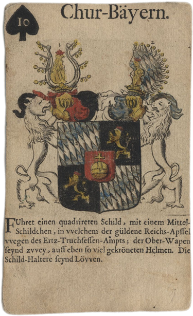 Heraldisches Kartenspiel, Wappenkarte, kolorierter Kupferstich, Hersteller unbekannt, wohl Nürnberg um 1692