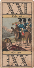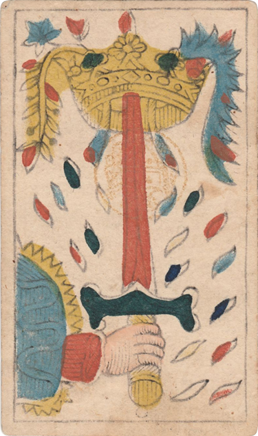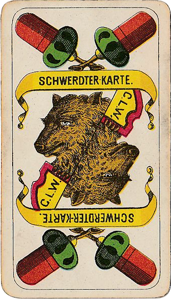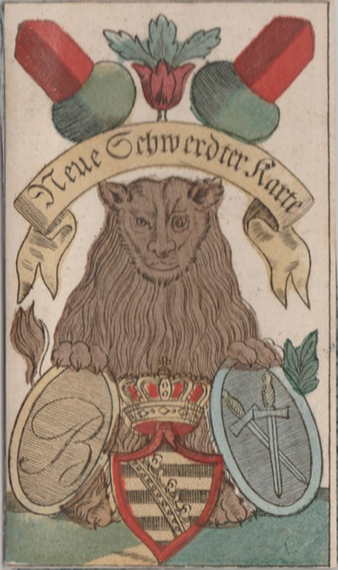 Solo-Spielkarten, Schwerterkarte, kolorierter Holzschnitt, Samuel Gottlieb Boehme, Dresden um 1790