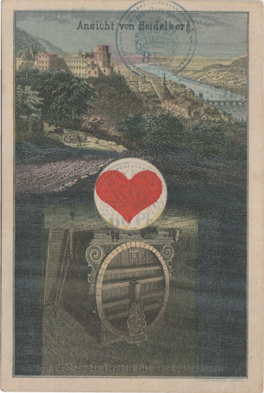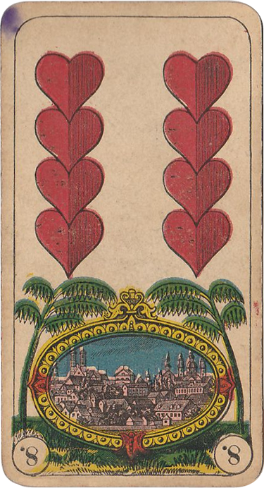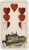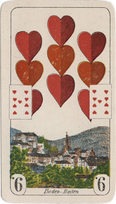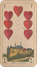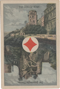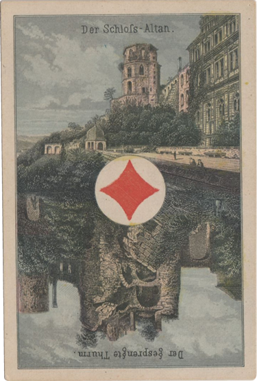 Feine Whist Spielkarten, Souvenirkarten Heidelberg, kolorierter Kupferstich, Maximilian Frommann, Darmstadt um 1860